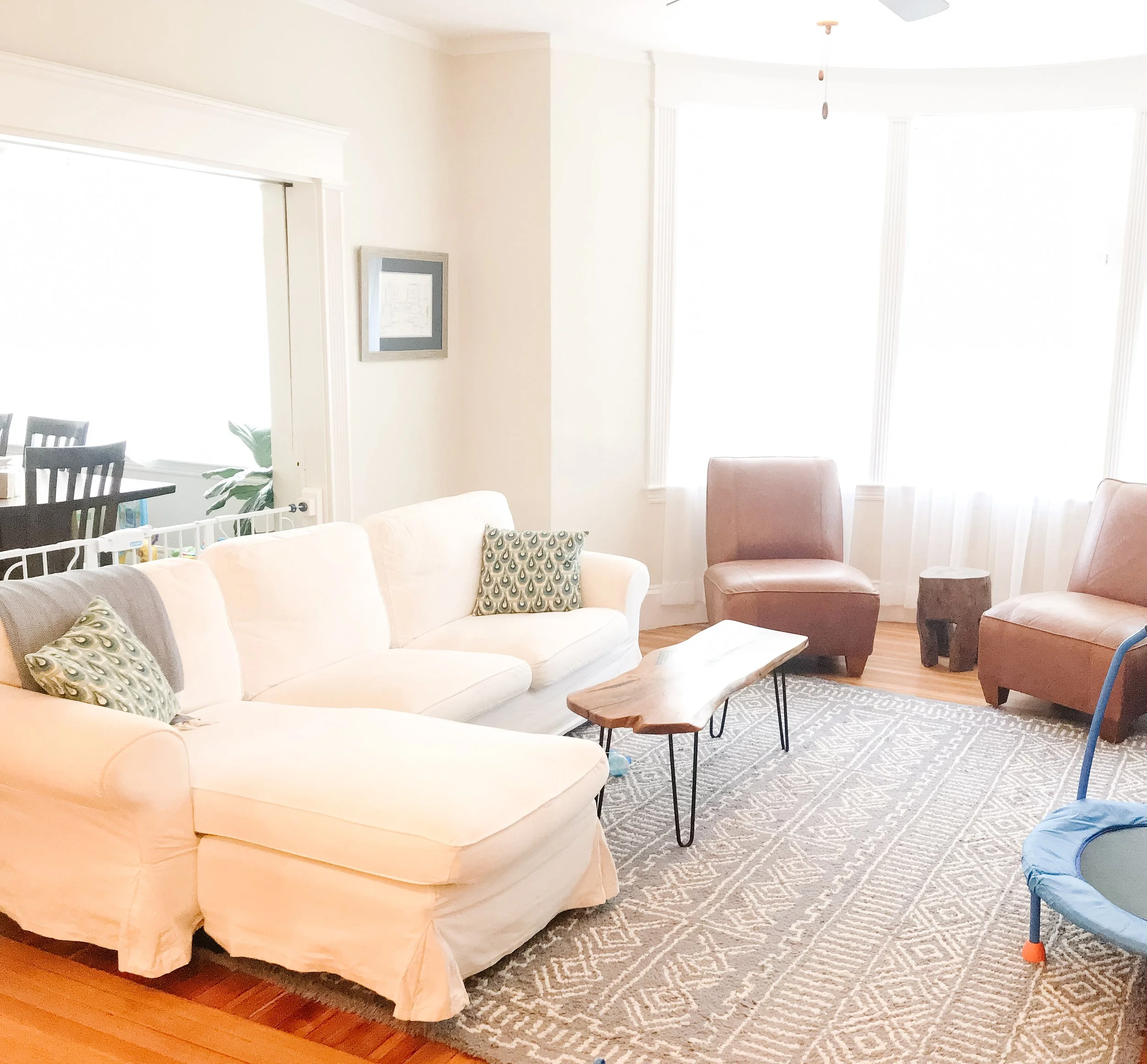 This living room had beautiful light with its large bay window, but the room was very much isolated from the rest of the apartment. It was closed-off from the dining room by a walled-in doorway. There was also a wall with two doors on it separating the living room from the hallway, across from which was a door into the kitchen. We not only opened the doorway into the dining room, but we also did away with the walls on the interior side of the room, facing the kitchen. The result was an open, airy and bright space open to the kitchen. It made the room feel much larger, and that beautiful light could be enjoyed from the kitchen as well. The old brick fireplace had also been encased, but we removed the wall that covered it, exposing the old brick. This also made the room feel bigger, because we could hang the television and keep the other electronics on the built-in bookcase that we added, so that none of that sort of thing took up any space in the footprint of the room.