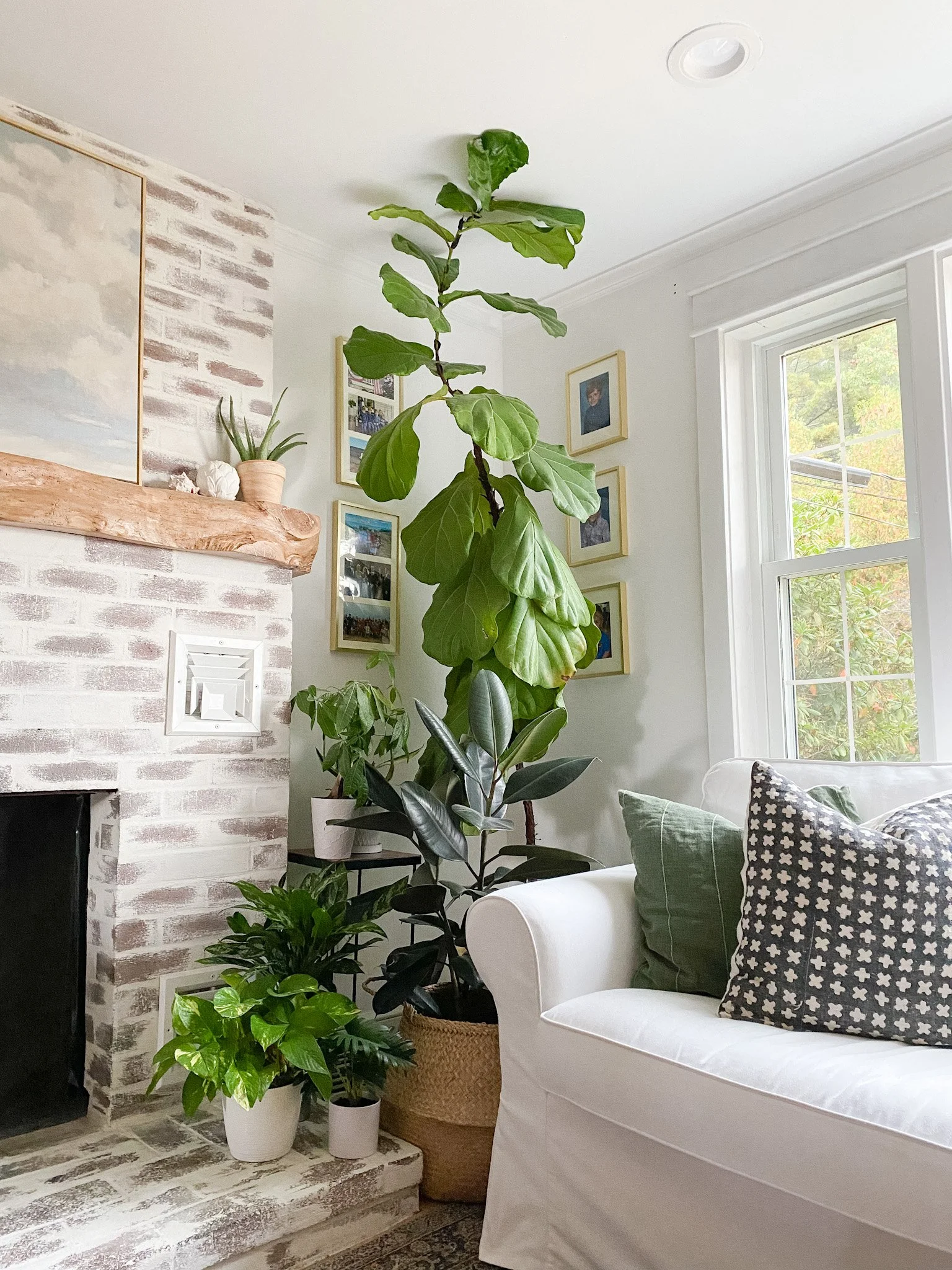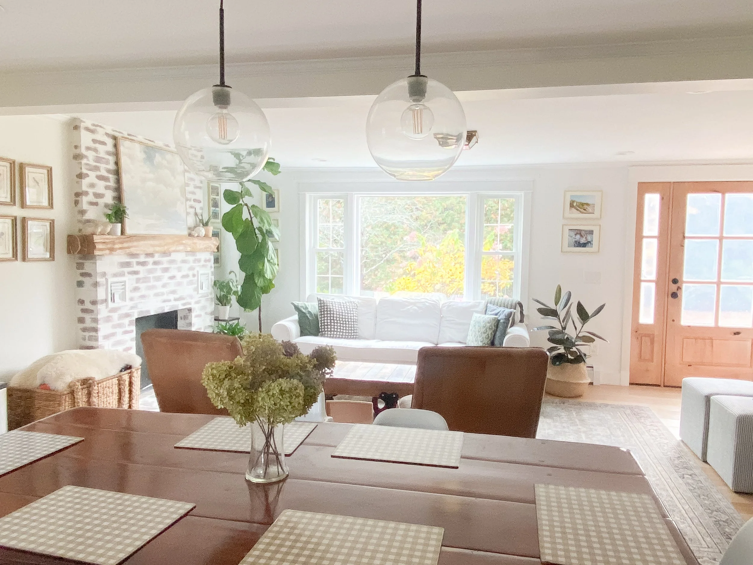 Typical of a cape style home, this living room was separated from the kitchen by a wall. It also had 1970-style brick used on the fireplace, a blue ceiling, and vinyl wood flooring. We opened the space up to the kitchen by removing the wall, put in new oak flooring, and painted the walls and ceiling. We also refinished the fireplace with mortar, for a german shmear look, so that we could celebrate the brick material, but cover-up the periodic black bricks, and give a little more character to the too-perfect red ones.